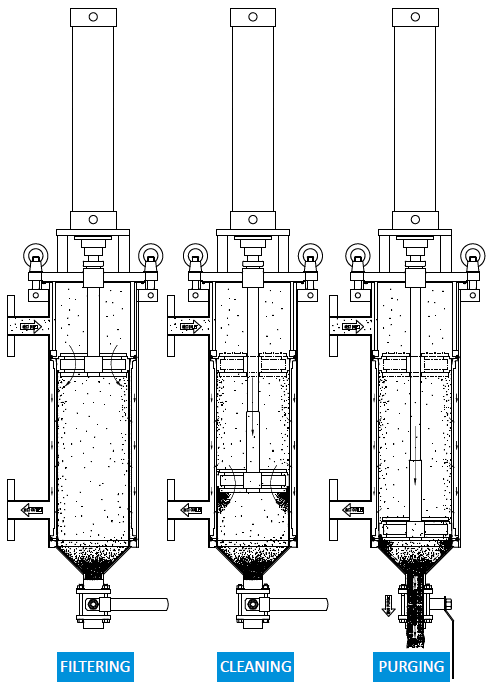 Skrapen beveger seg nedover og samler urenheter i bunnen. Når den går opp igjen, skyves resterende partikler til toppen av filterelementet og skylles bort. Denne prosessen gjentas kontinuerlig – uten at driften avbrytes.
